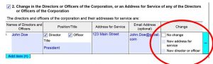 The prescribed form may present a challenge as it does not readily allow to identify the existence of a vacancy on the board. Once you click the box to identify a change to the directors/officers, it allows you to choose between “No change”, “new address of service” or “new director or officer”. This seems to indicate that the ICU is only required when a new director/officer is appointed (to fill a vacancy for instance). What is one to do when the only change is the result of a departure (a resignation, for instance) and that no one is appointed to replace him/her?